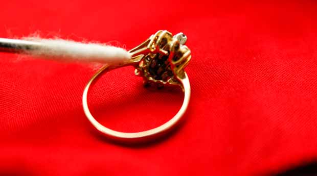 - отшлифовать или отполировать поверхность ювелирного изделия можно с помощью фланели или сукна. Как правило это делают после чистки зубной щеткой или нашатырным спиртом либо же для того чтобы попросту убрать пыль с украшения, которая накопилась на нем за день. Также для более глубокой чистки можно использовать спирт или водку. Изделие протирают фланелью либо тампоном предварительно смочив ткань жидкостью. Для чистки трудно доступных мест ювелирного украшения можно воспользоваться ватной палочкой, предварительно смоченной в жидкости;